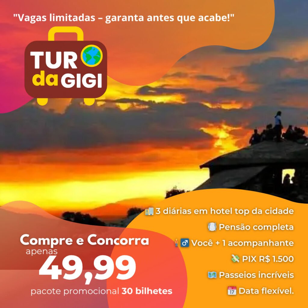 3 diárias em um dos melhores hotéis da cidade Você + um acompanhante especial Passeios inesquecíveis R$1.500 em dinheiro pra curtir como quiser Data flexível – você escolhe quando viajar!